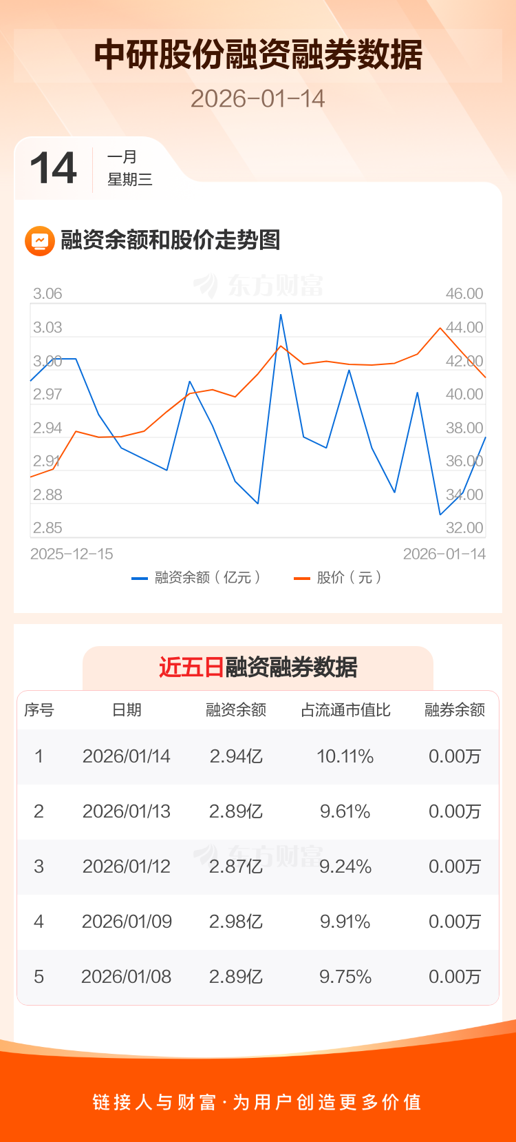交易所最新数据显示,中研股份于2026年1月14日获融资买入4520.55万元,融资偿还4036.10万元,当日融资净买入484.45万元。目前,该股融资余额2.94亿,占流通市值比例为10.11%。