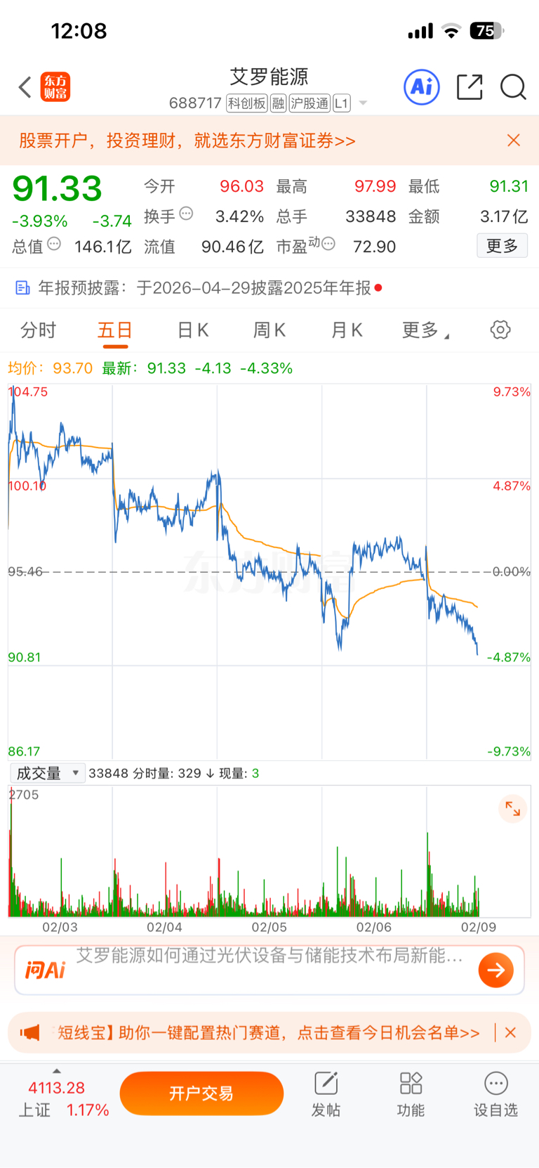 $艾罗能源(SH688717)$ 五日有四天都是一开盘就冲高回落的,这种只要放量涨五个点才能进