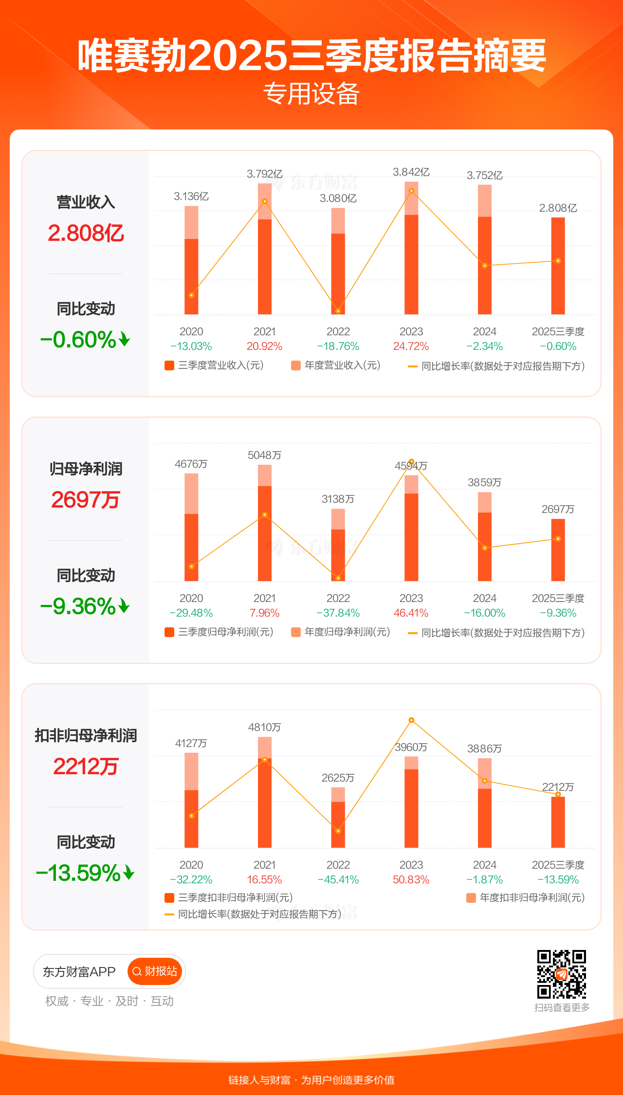 唯赛勃10月30日发布2025年三季报显示,公司前三季实现营业收入2.81亿元,同比下滑0.60%;归母净利润2696.92万元,同比下滑9.36%;扣非归母净利润2212.11万元,同比下滑13.59%。