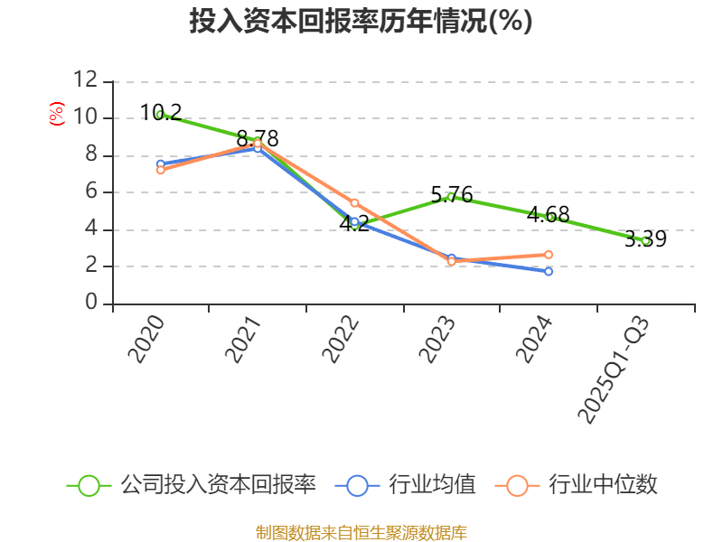 盈利能力方面, 2025年前三季度公司加权平均净资产收益率为3.43%,同比下降0.43个百分点。公司2025年前三季度投入资本回报率为3.39%,较上年同期下降0.3个百分点。