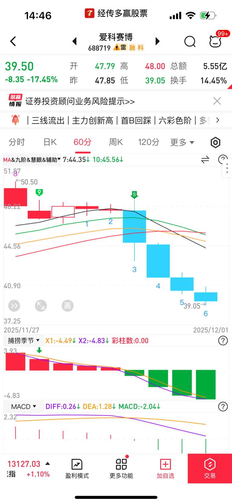 $爱科赛博(SH688719)$ 60分钟9转下行到6,你抄什么底呢?明天还得继续跌。