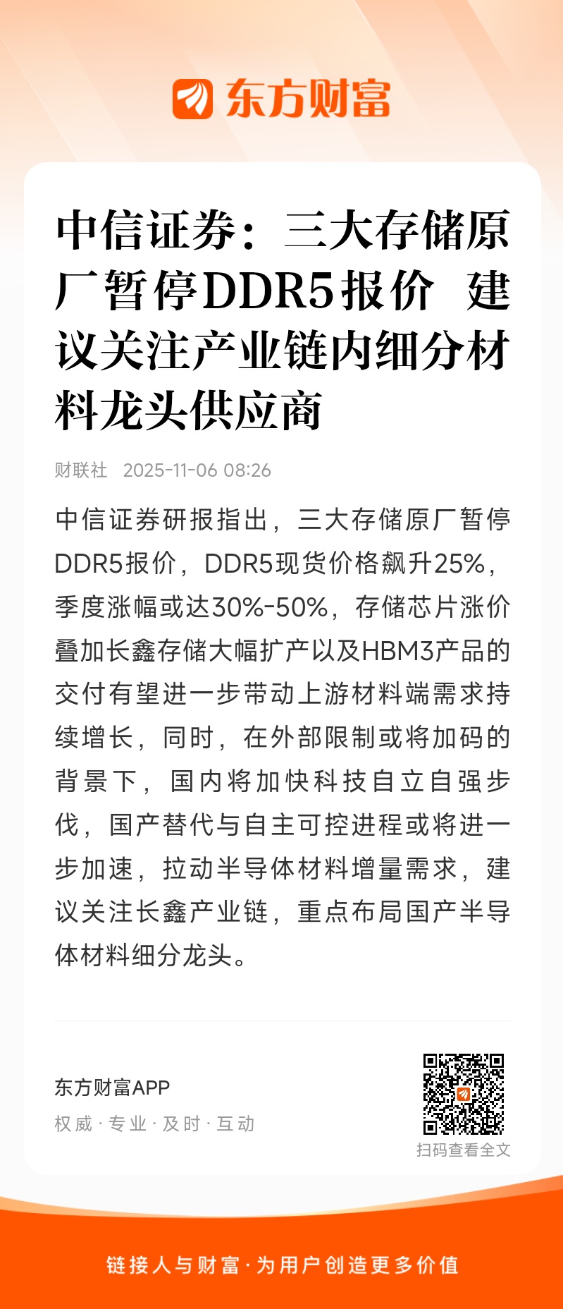 中信证券研报指出,三大存储原厂暂停DDR5报价,DDR5现货价格飙升25%,季度涨幅或达30%-50%,存储芯片涨价叠加长鑫存储大幅扩产以及HBM3产品的交付有望进一步带动上游材料端需求持续增长,同时,在外部限制或将加码的背景下,国内将加快科技自立自强步伐,国产替代与自主可控进程或将进一步加速,拉动半导体材料增量需求,建议关注长鑫产业链,重点布局国产半导体材料细分龙头。