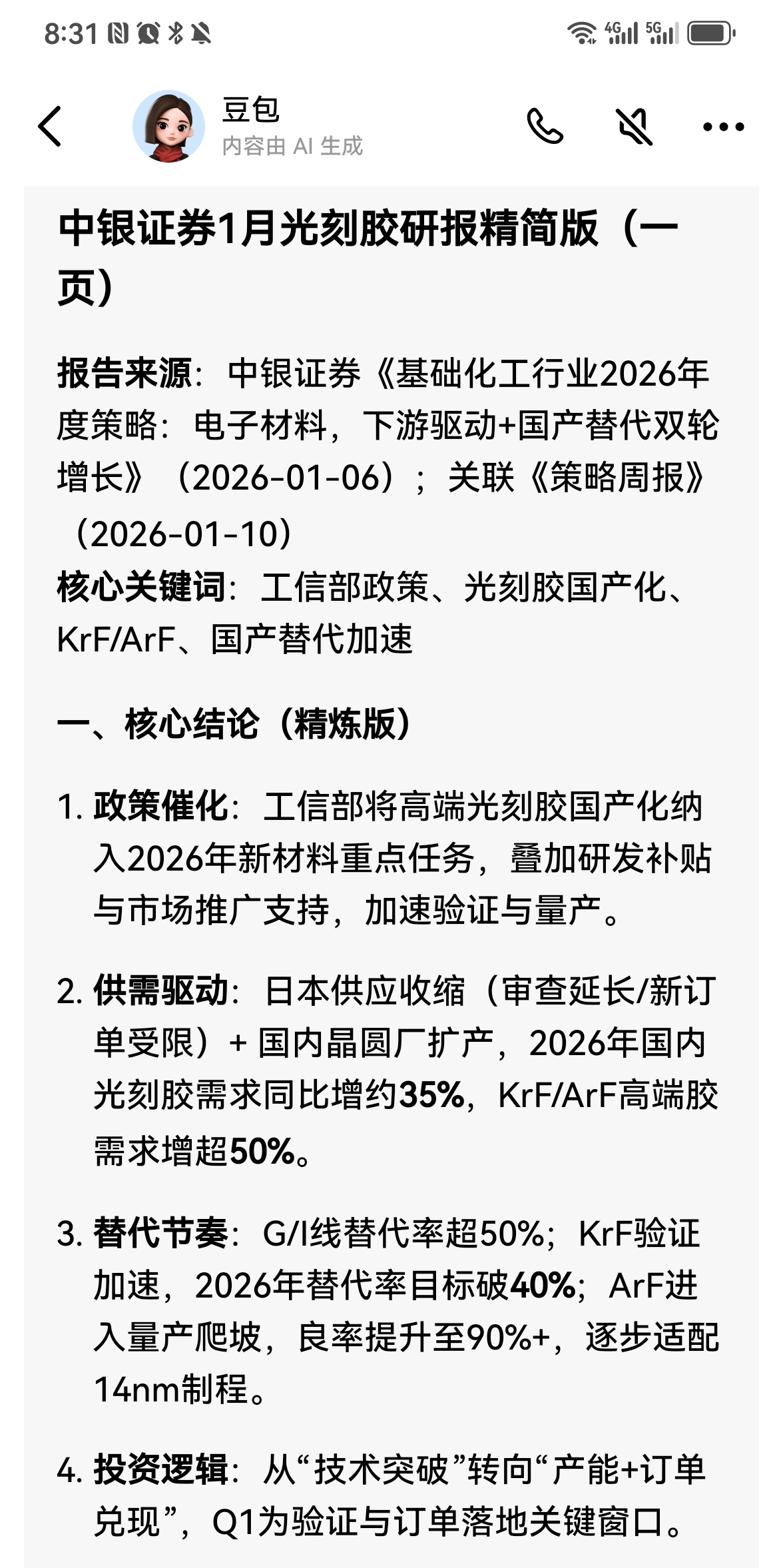 根据中银证券研报消息,工信部将“高端光刻胶国产化”纳入2026年新材料产业发展重