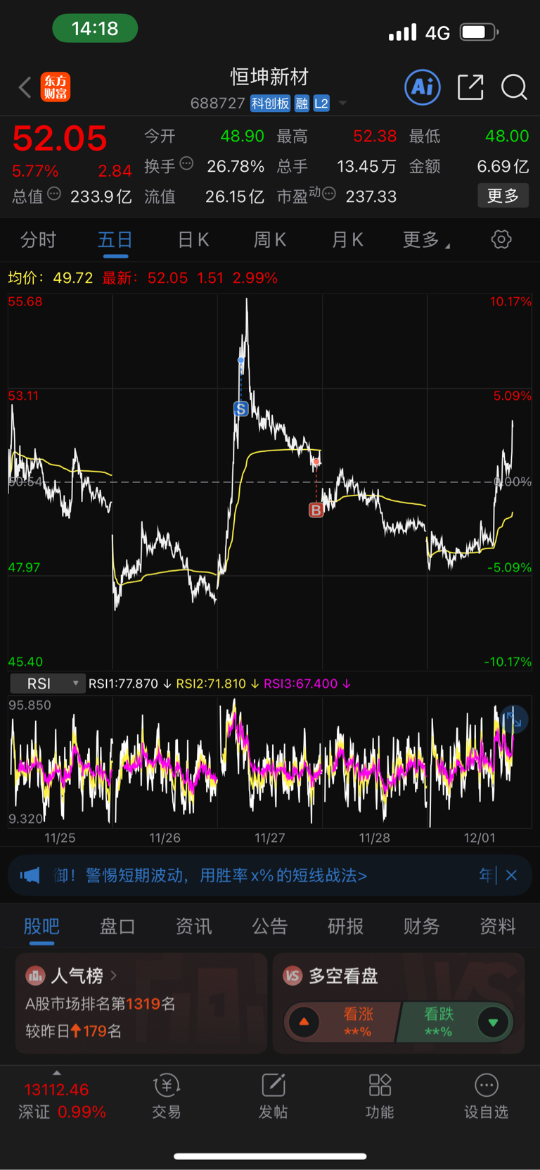 $恒坤新材(SH688727)$ 没做T又错过了。