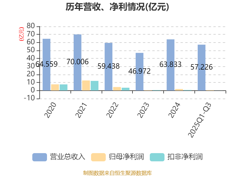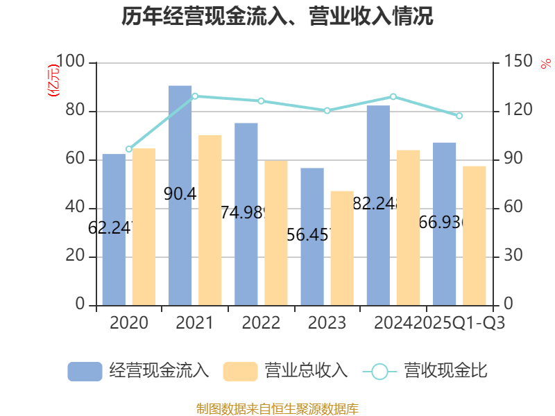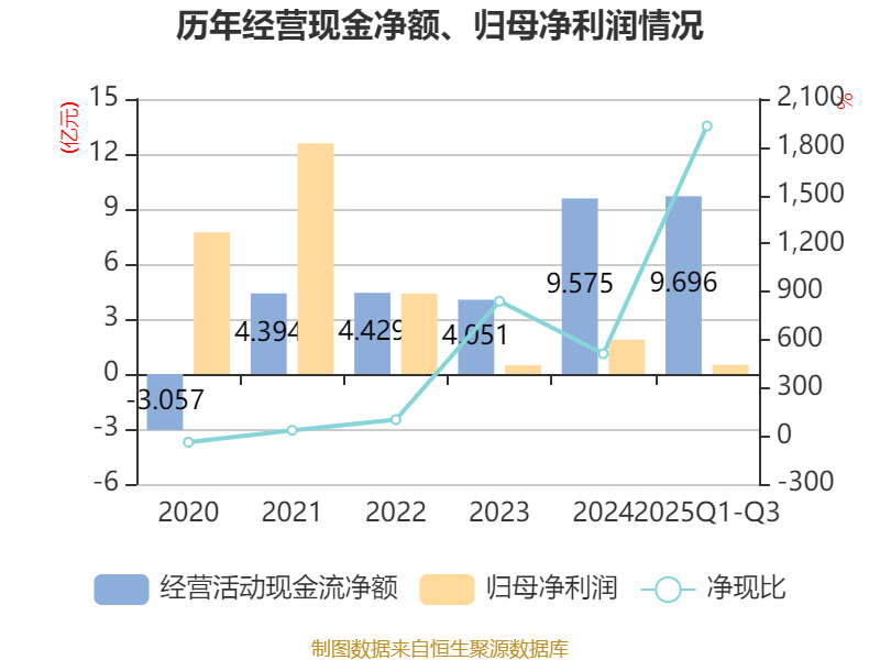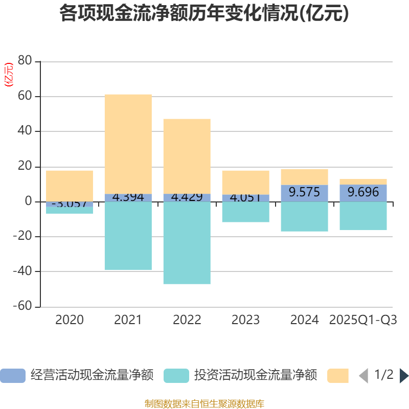 2025年前三季度,公司经营活动现金流净额为9.7亿元,同比增长746.87%;筹资活动现金流净额3.19亿元,同比减少6.66亿元;投资活动现金流净额-16.24亿元,上年同期为-13.4亿元。
