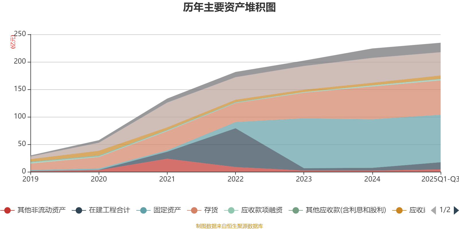 资产重大变化方面,截至2025年三季度末,公司在建工程合计较上年末增加173.34%,占公司总资产比重上升3.4个百分点;固定资产较上年末减少2.19%,占公司总资产比重下降2.57个百分点;货币资金较上年末减少6.38%,占公司总资产比重下降2.12个百分点;其他非流动资产较上年末增加89.54%,占公司总资产比重上升0.82个百分点。