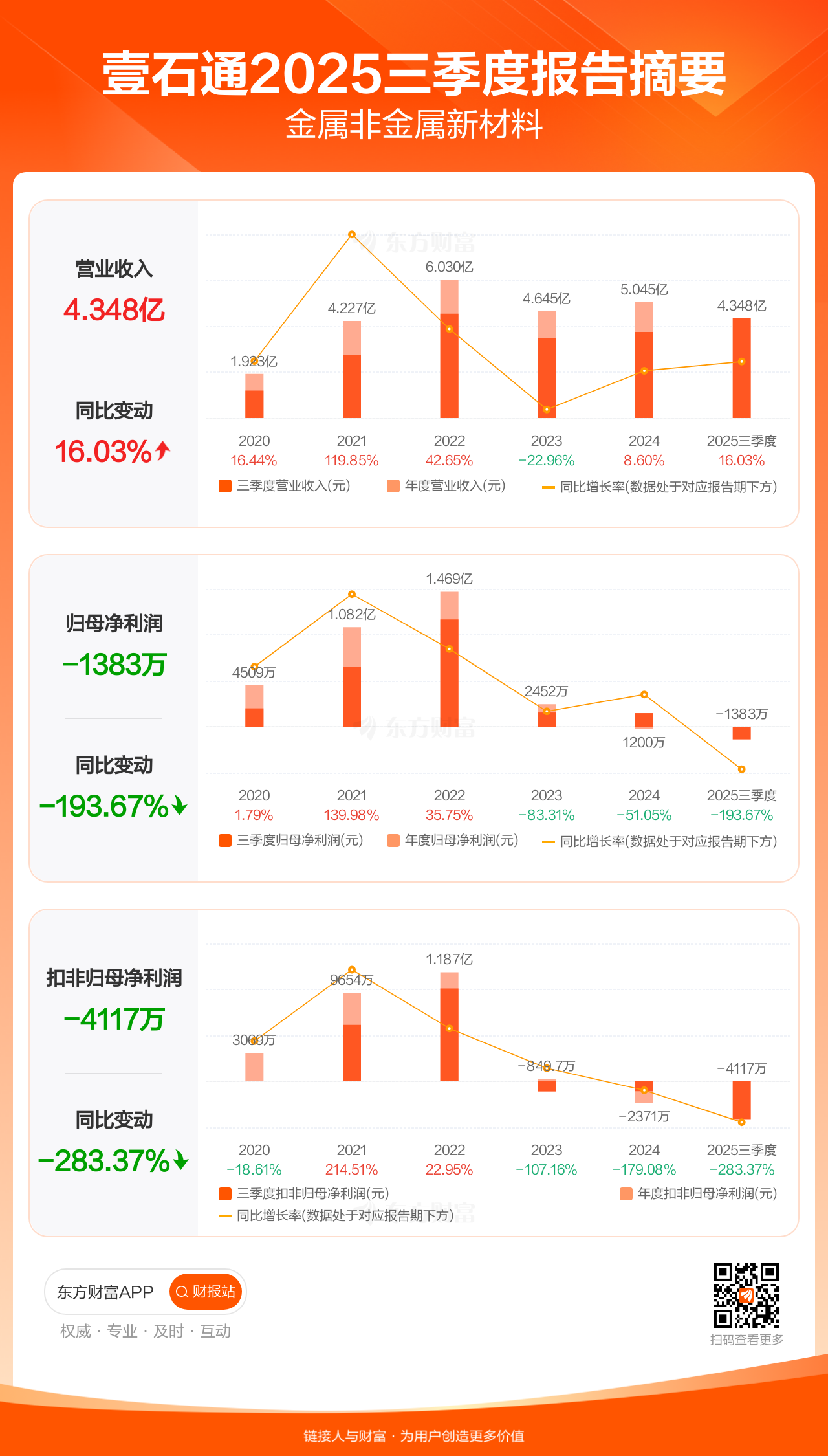 壹石通10月31日发布2025年三季报显示,公司前三季实现营业收入4.35亿元,同比增长16.03%;归母净利润-1382.51万元;扣非归母净利润-4116.99万元。
