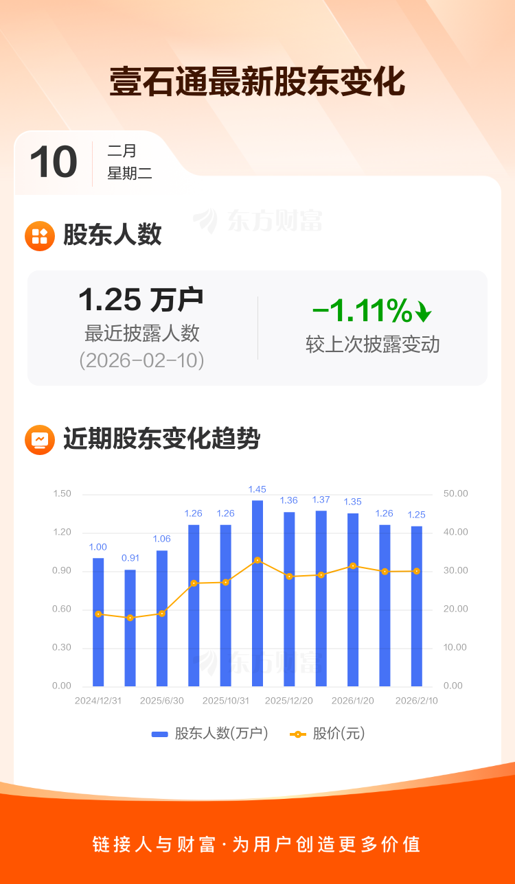 壹石通最新披露数据显示,截至2月10日公司股东户数为1.25万户,较上期(2026年1月31日)减少140户,降幅为1.11%。户均持有流通股数量由上期的1.58万股上升至1.60万股,户均持股金额由上期的47.21万元增加至47.88万元。