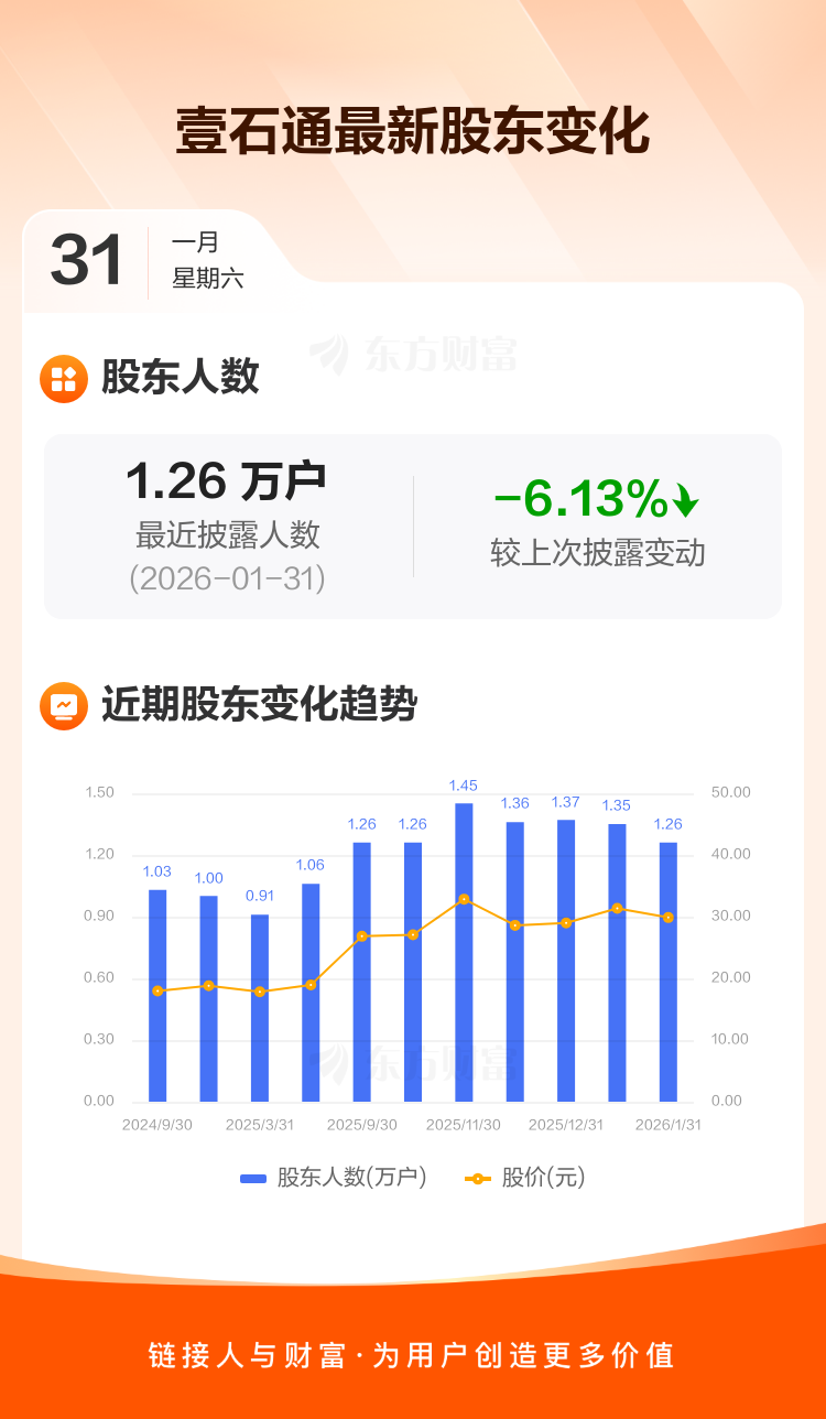 壹石通:截至1月31日最新股东户数1.26万户,较上期减少6.13%