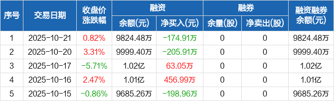 中自科技:融资净偿还174.91万元,融资余额9824.48万元(10-21)
