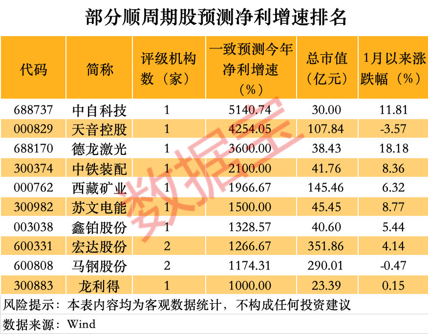 据证券时报·数据宝统计,根据机构一致预测,在汽车、商贸零售、机械、建材、有色等周期板块中,有10只个股2026年净利将暴增10倍(在机构一致预测2025年净利为正的基础上)。其中增幅位居第一的是中自科技,机构一致预测今年净利增速超过51倍。公司是一家专注于新材料、新能源的研发、生产和销售的高新技术企业,是我国环境催化剂领域的少数主要国产厂商之一。西南证券看好中自科技传统催化剂业务稳居行业前列、储能及储能+业务持续增长、复合材料业务即将投产的多赛道布局。