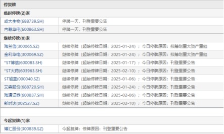 上证报中国证券网讯 2月11日,2家公司临停:成大生物、内蒙华电,1家公司复牌:博汇股份。