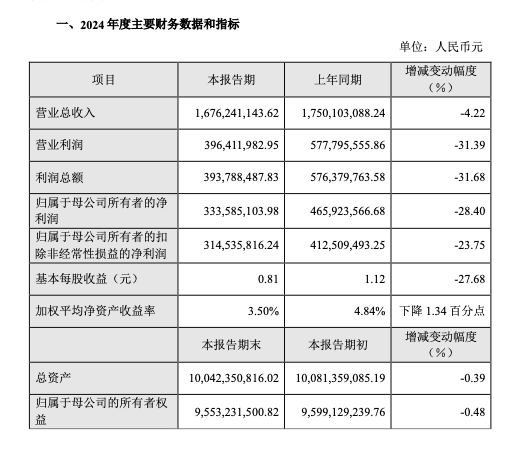 2月25日晚间,辽宁成大生物股份有限公司(以下简称“成大生物”或“公司”)发布2024年度业绩快报公告。公告称,2024年实现营业总收入16.76亿元,同比下降4.22%;实现归属于母公司所有者的净利润3.34亿元,同比下降28.40%。