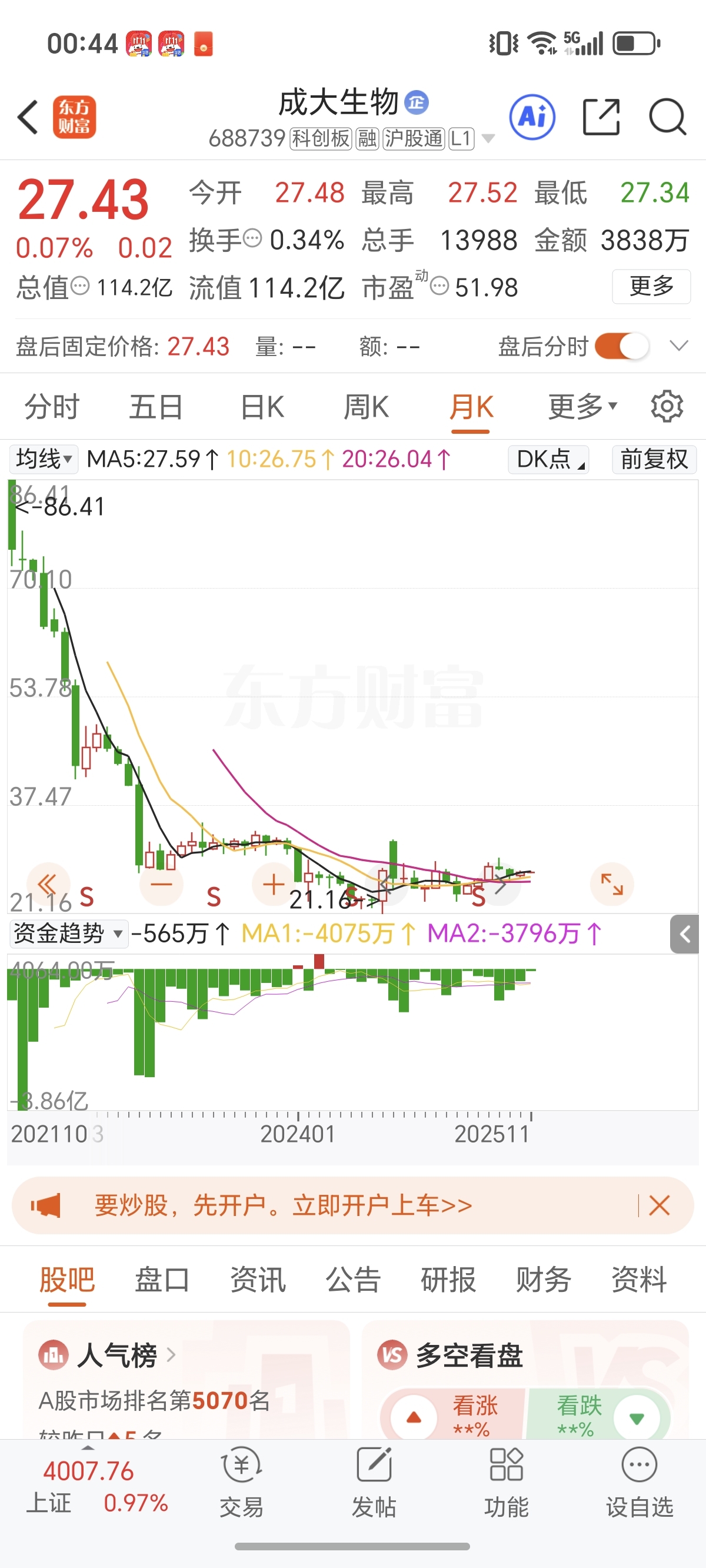 $成大生物(SH688739)$ 上市四年只有一个月资金净流入,多数月份都是净流出状态。两市少有,全球罕见。尤其今年,科创板指数都翻倍了。每月还是净流出。