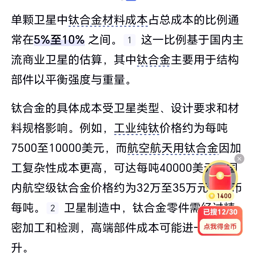 单颗卫星钛合金材料成本占总成本5%~10%。用量还是蛮大的!
