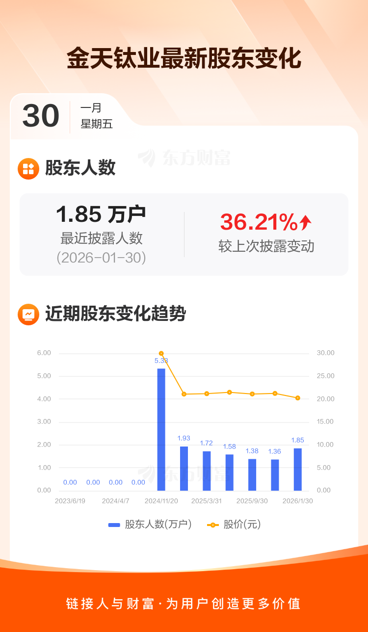 金天钛业:截至1月30日最新股东户数1.85万户,较上期增加36.21%