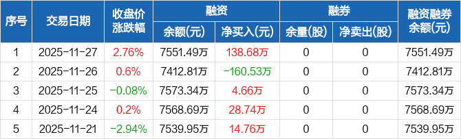 汉邦科技:融资净买入138.68万元,融资余额7551.49万元(11-27)
