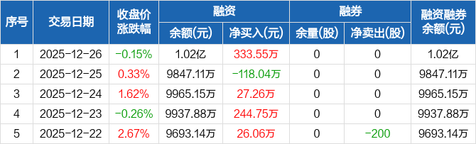 胜科纳米:融资净买入333.55万元,融资余额1.02亿元(12-26)