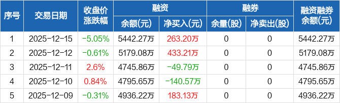 赛分科技:融资净买入263.2万元,融资余额5442.27万元(12-15)