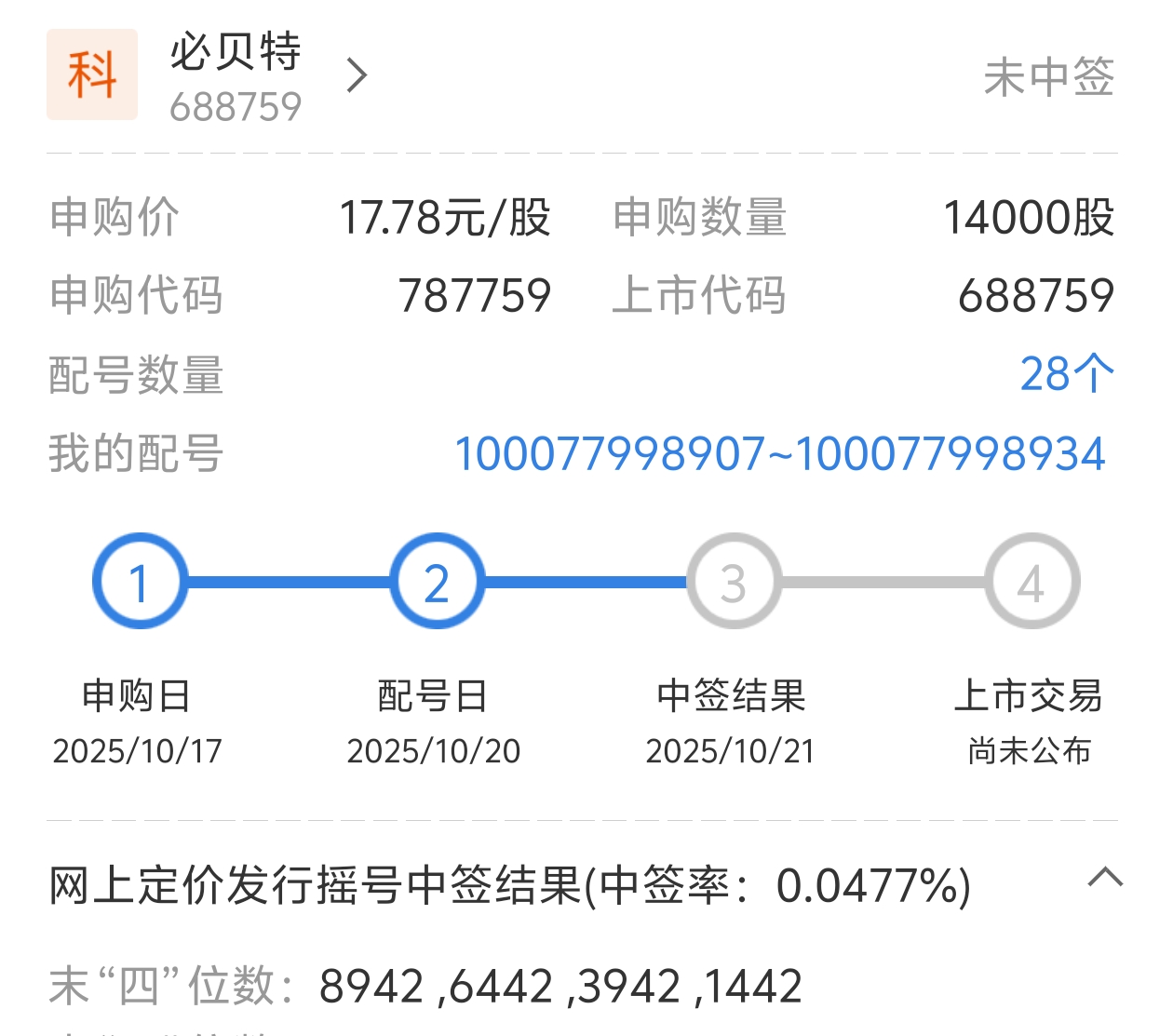 $必贝特(SH688759)$ 只差8个号,下次一定中