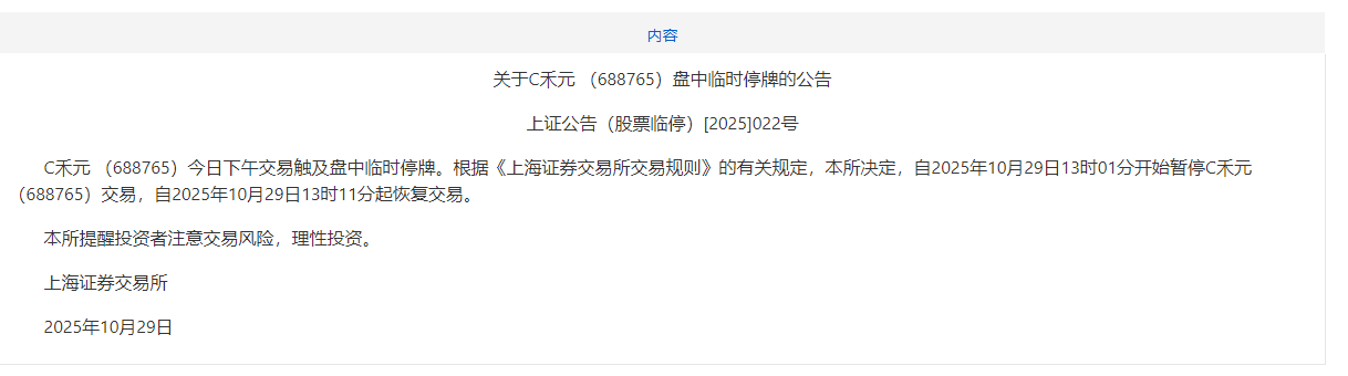 据上交所10月29日消息,C禾元 (688765)今日下午交易触及盘中临时停牌。根据《上海证券交易所交易规则》的有关规定,上交所决定,自2025年10月29日13时01分开始暂停C禾元 (688765)交易,自2025年10月29日13时11分起恢复交易。