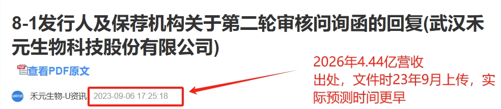 $禾元生物-U(SH688765)$  11月5日,平台出现:禾元生物官方2026年营收预测4.44亿 等消息。预告实则是近3年前的预测(下图),并没有考虑上市扩产前提下的预测!!