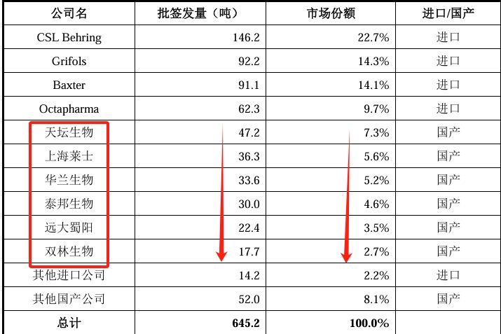 1. 上市后,2026年公司产能急剧扩张,产能增幅为1300%(130吨),产值达49.5亿元,考虑产品供不应求,62%的市场份额被国外公司把持(国产替代),公司营收将爆发式增长。产能将在2026年与国外巨头CSL(国内销量第一)看齐!