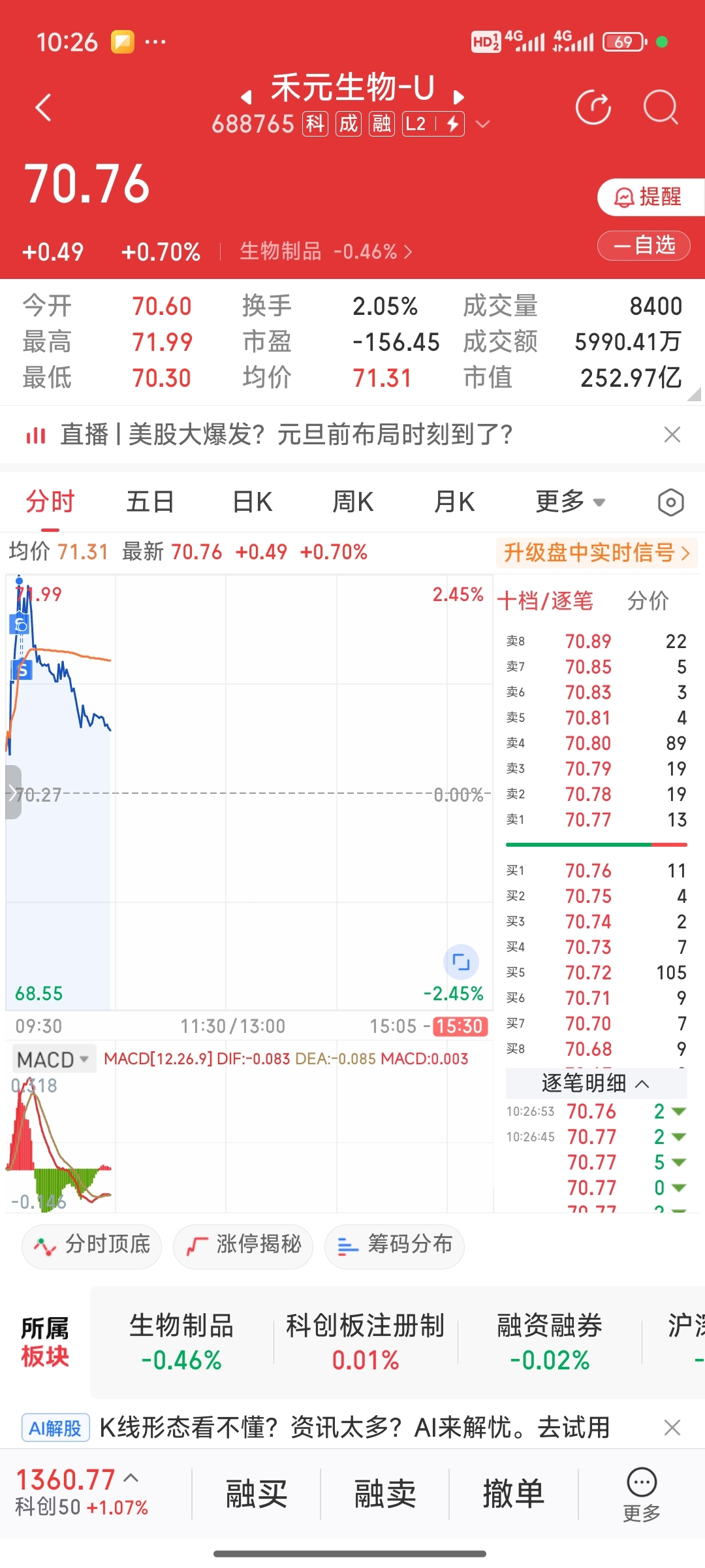 $禾元生物-U(SH688765)$ 71.99没成交完 又低价出了一点兄弟们了