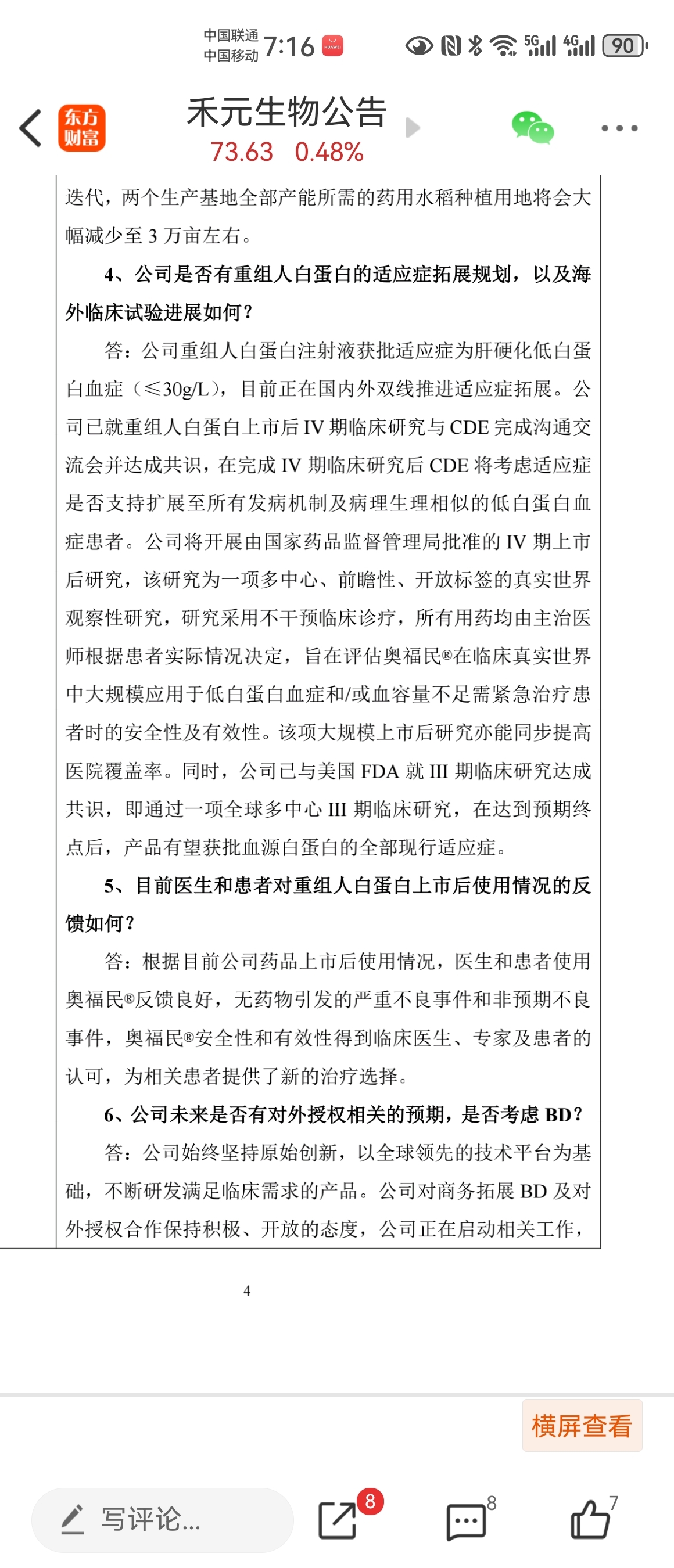 $禾元生物-U(SH688765)$ 看这个调研答复,用于低蛋白血症或血容量不足的研究,这就是四期临床阶段的研究内容,也就是扩大适应症的临床试验