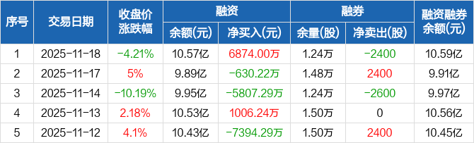普冉股份融资融券信息显示,2025年11月18日融资净买入6874万元;融资余额10.57亿元,较前一日增加6.95%