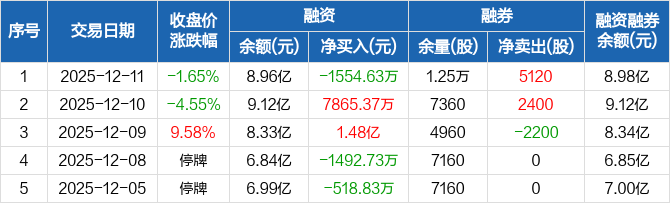 普冉股份:融资净偿还1554.63万元,融资余额8.96亿元(12-11)