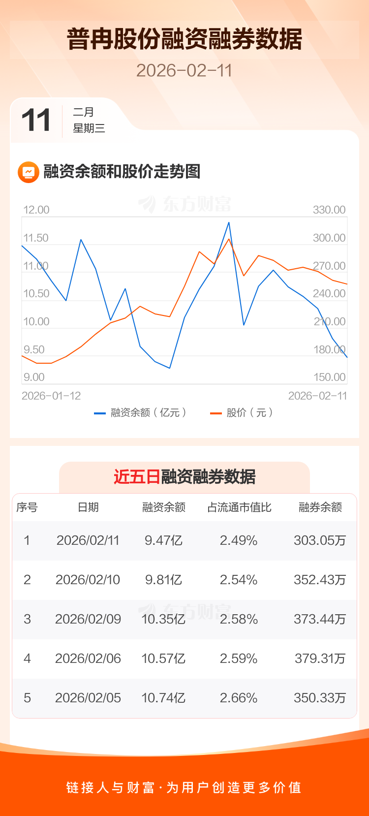 交易所最新数据显示,普冉股份于2026年2月11日获融资买入8397.75万元,融资偿还1.19亿元,当日融资净偿还3453.02万元。目前,该股融资余额9.47亿,占流通市值比例为2.49%。