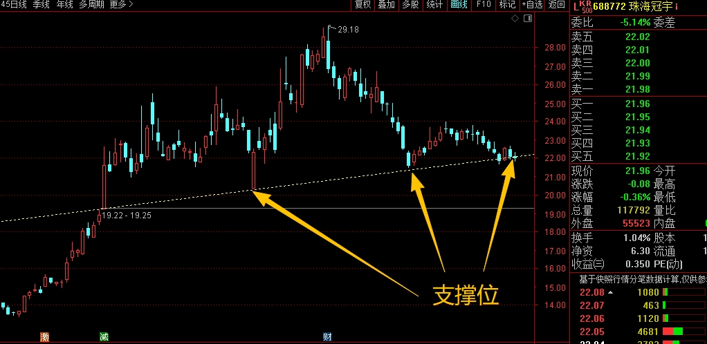 $珠海冠宇(SH688772)$ 近期走势较弱,短线来看,这里重点盯着脚底长期趋势线的支撑情况,能稳住就还能观察,但有效跌破就要注意破位风险,需要大幅减仓应对,不用纠结,等站稳再考虑回补也不迟。#炒股日记# #周末杂谈#