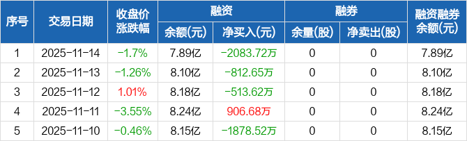 融资方面,当日融资买入3237.08万元,融资偿还5320.81万元,融资净偿还2083.72万元,连续3日净偿还累计3409.99万元。融券方面,融券卖出0股,融券偿还0股,融券余量0股,融券余额0元。融资融券余额合计7.89亿元。