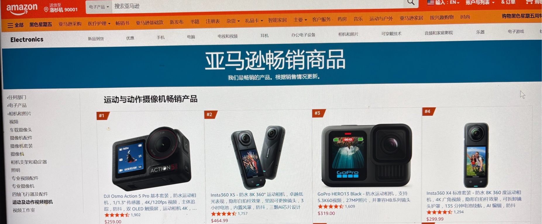 亚马逊美国站运动相机畅销榜前四里面两个影石的,而且单品价格高,怕你们看不懂给你们