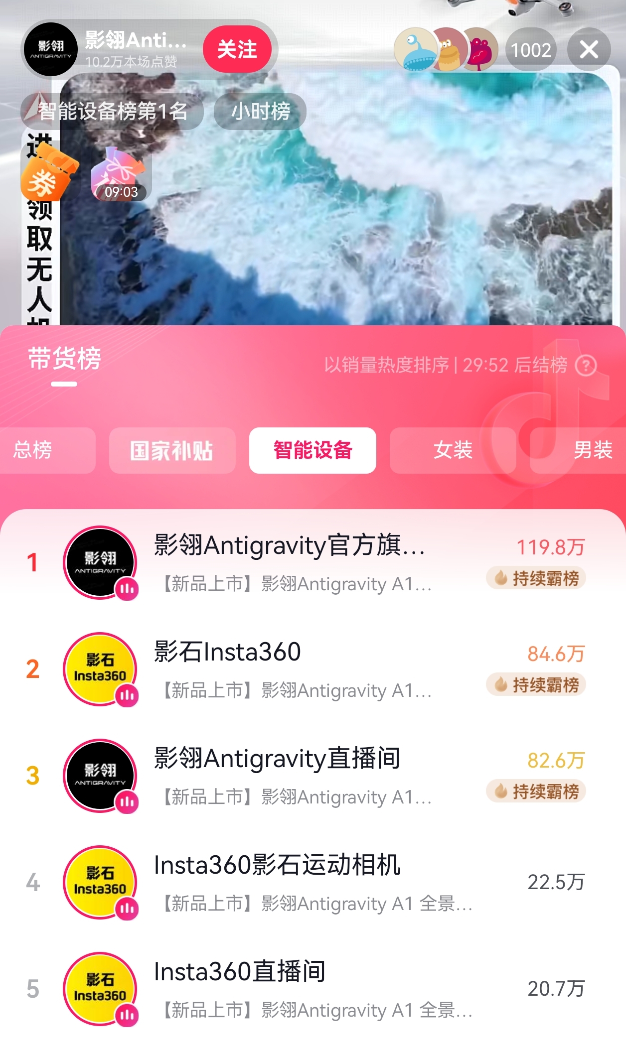 $影石创新(SH688775)$ 论带货还是抖爸爸强,霸榜智能设备前五