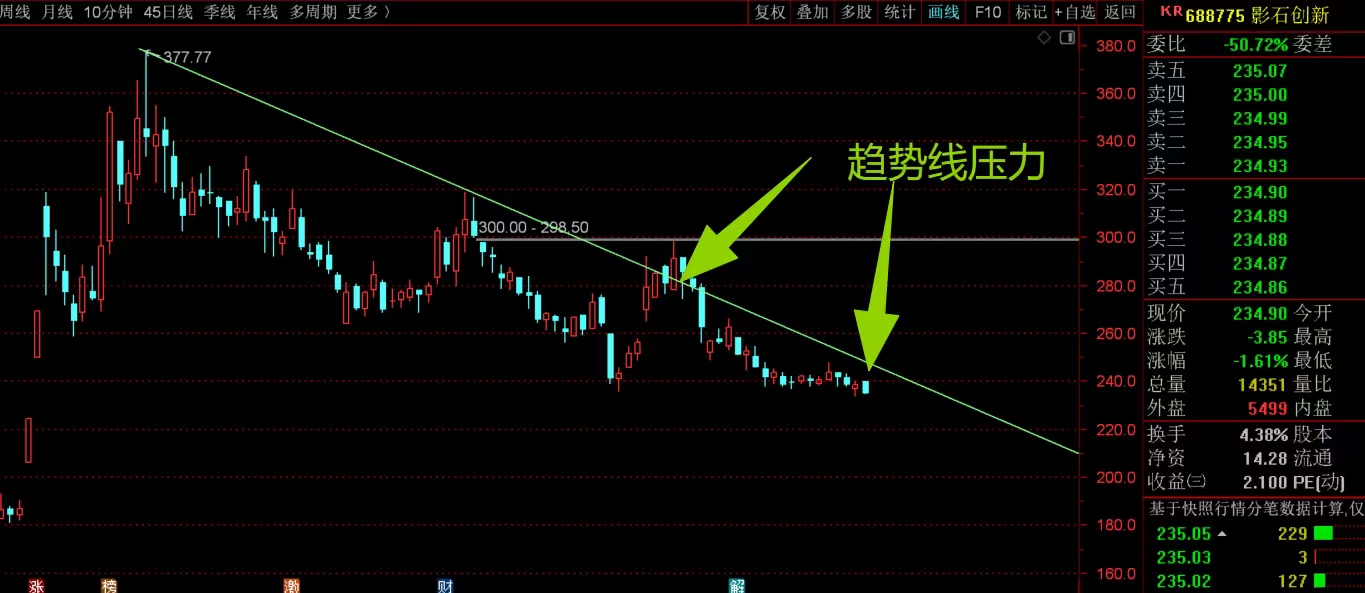 $影石创新(SH688775)$ 次新股,前期冲高大幅拉高之后,这几个月以来都是高位震荡回落的趋势,没有明显的反弹走势,相对走得比较弱,整体看都被头上趋势线缩压制,整体上看,没有能拉起来突破站稳趋势线支撑,都不考虑参与,管住手。#炒股日记# #周度策略#