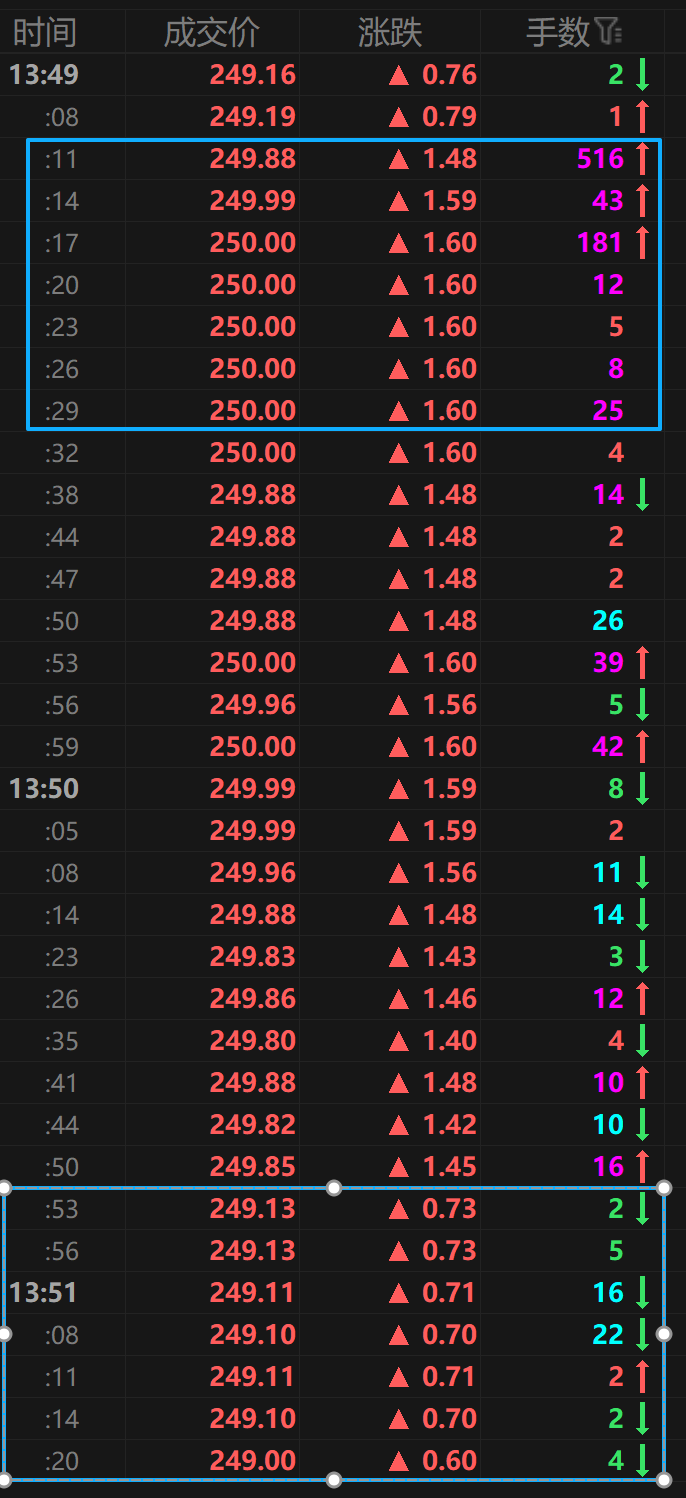 影石里面的资金分歧很大,空头长期占主导,多方承接力不足。刚才250元附近将近19