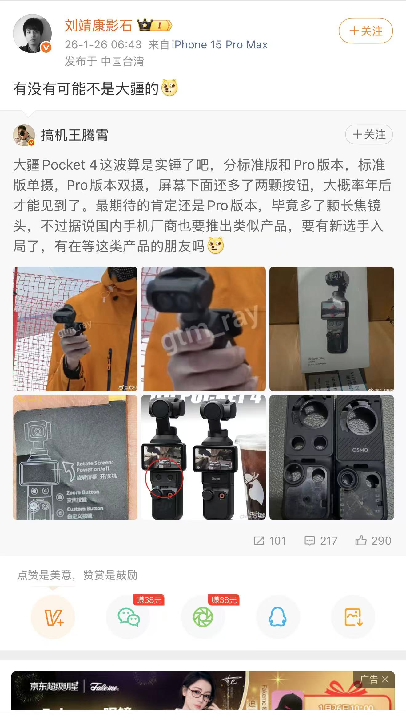 与此同时,有网友在微博上发布“大疆Pocket 4分标准版和Pro版本,Pro版本双摄,还多了颗长焦镜头”。1月26日,影石CEO刘靖康转发表示:“有没有可能不是大疆的?”这一表态,引发外界猜测该双摄设备实为影石旗下新品。