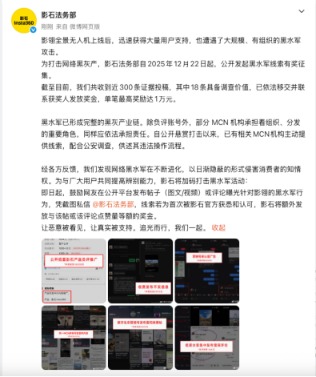 影石法务部表示,针对其新款无人机“影翎A1”的“黑水军”行为已形成产业链,包括公开招募发布负面内容、营销号有偿诋毁、MCN机构组织多账号发布雷同信息等。自公开悬赏以来,已有相关MCN机构主动提供线索,配合公安调查,供述其违法操作流程。