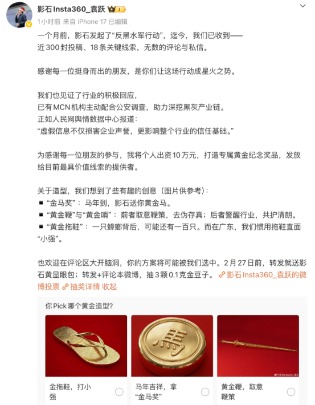 为持续净化网络环境,影石宣布升级线索征集活动:即日起,鼓励用户在公开平台发布帖子或评论曝光针对“影翎”的“黑水军”行为,凭截图私信官方。若线索属首次被影石采纳,将额外发放与该帖或该评论点赞数等额的奖金。