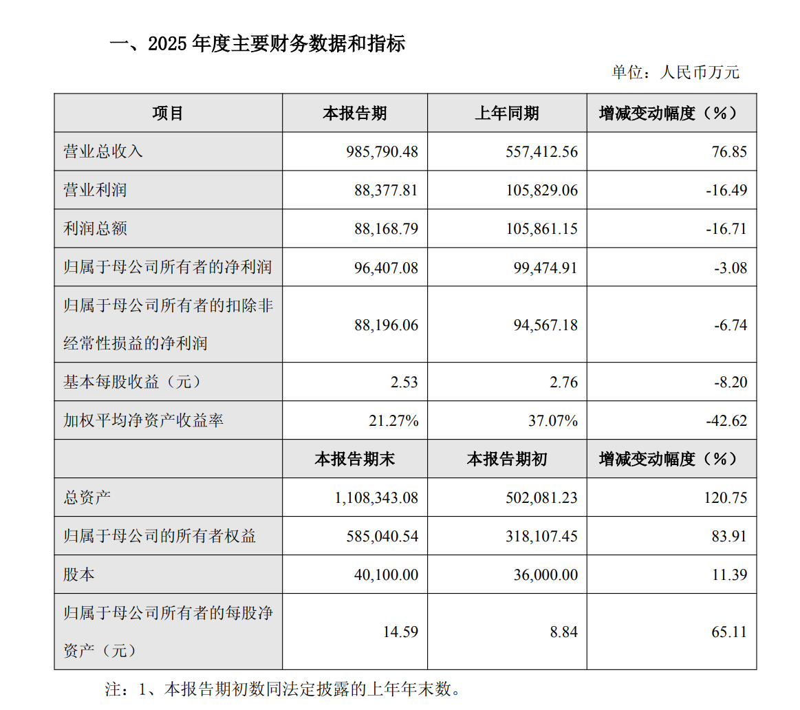 另据公告,报告期末,公司总资产110.83亿元,较报告期初增加120.75%;归属于母公司的所有者权益58.50亿元,较报告期初增加83.91%。主要系公司2025年首次公开发行股票(IPO)募集资金、运营资金沉淀及备货所致。
