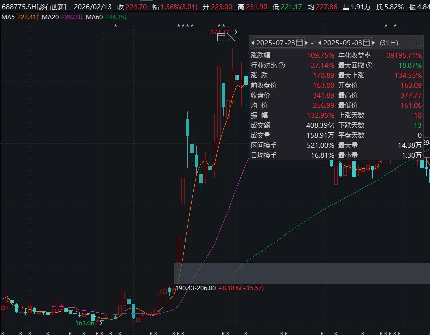 Wind行情数据显示,在上市一个月后,影石创新的股价迎来了一波大行情——2025年7月23日至9月3日,影石创新股价在31个交易日内从161.06元(前复权,下同)的最低点一度涨至377.77元的最高点,区间最大涨幅达到134.55%。