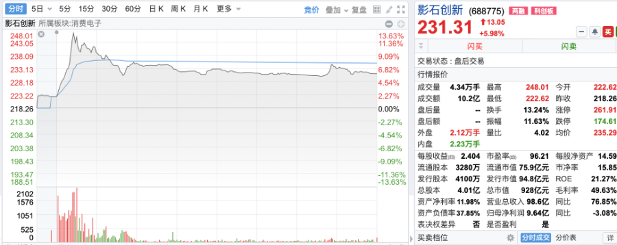 截至3月2日收盘,影石创新报价231.31元/股,总市值928亿元。