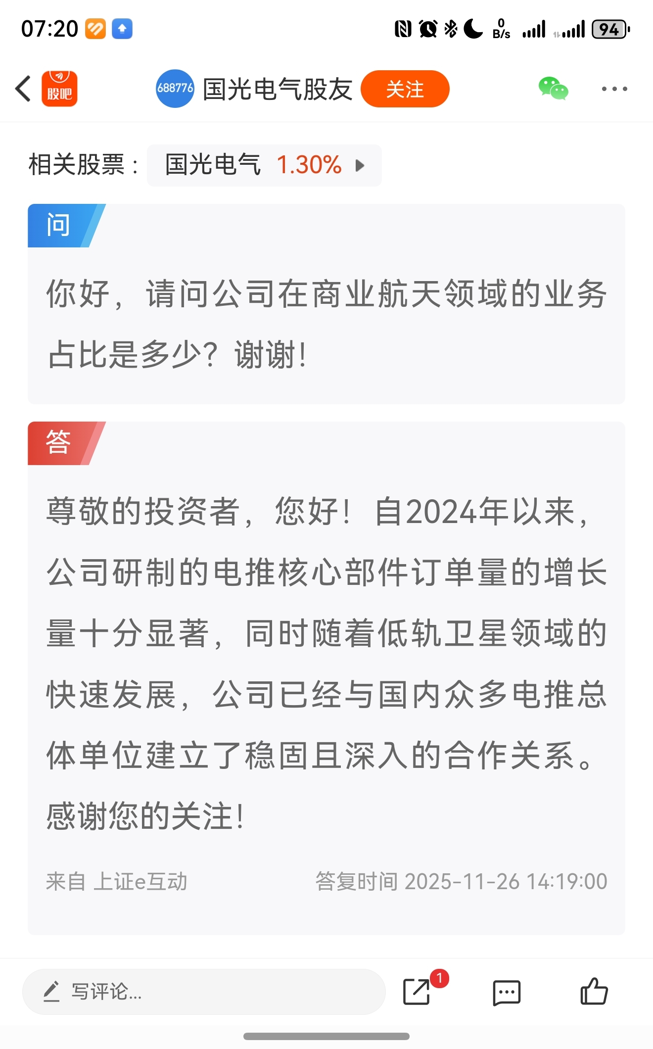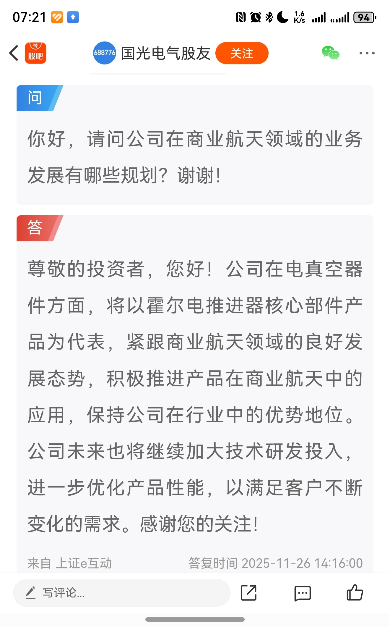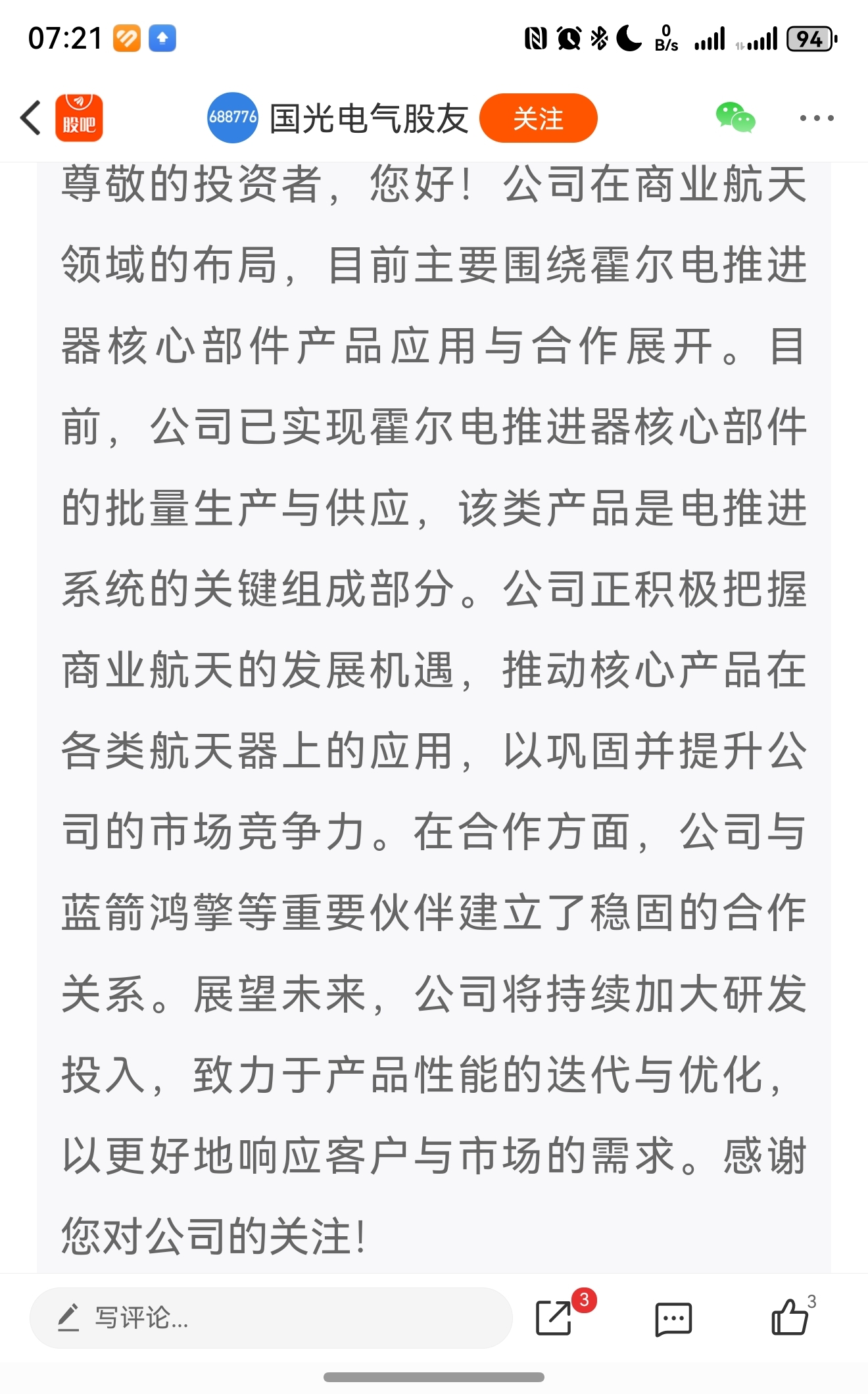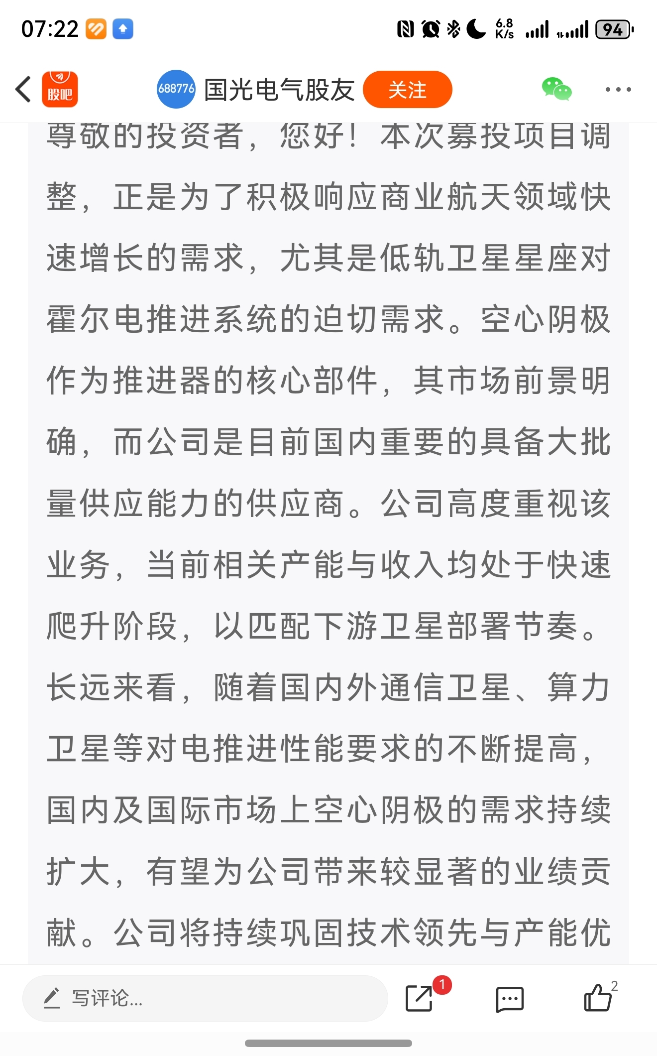 内部:周五晚上国光电气公告了临时股东大会决议,其中一项决议是变更募投项目:将更多资金投入商业航天领域。