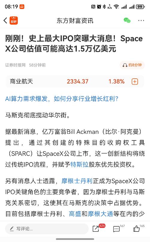 SpaceX即将IPO,据消息人士称,摩根士丹利有望成为太空探索技术公司SpaceX首次公开募股(IPO)的主承销商。IPO私募的估值8000亿美金,市场预期1.5万亿美金,将成人类历史最大IPO,如果来大A,按照炒摩尔线程和沐曦的市梦率炒法,你说五万亿美金我都信!