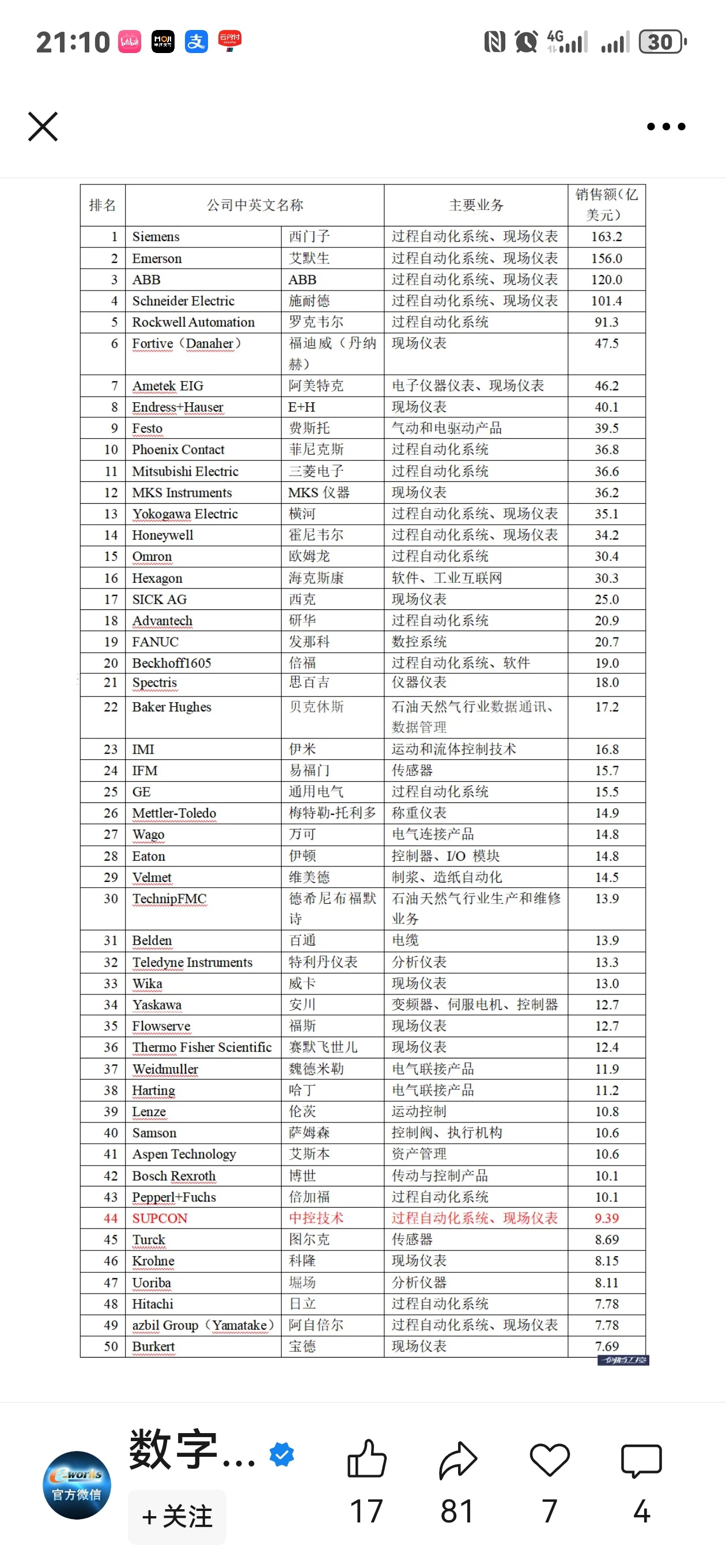 $中控技术(SH688777)$ 中企进了榜单,大概率就能赶超对手,国产替代是长期国策。