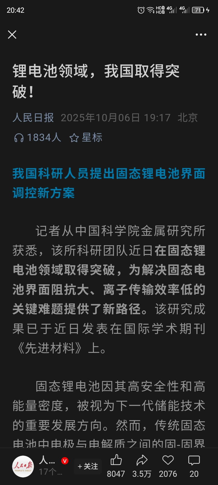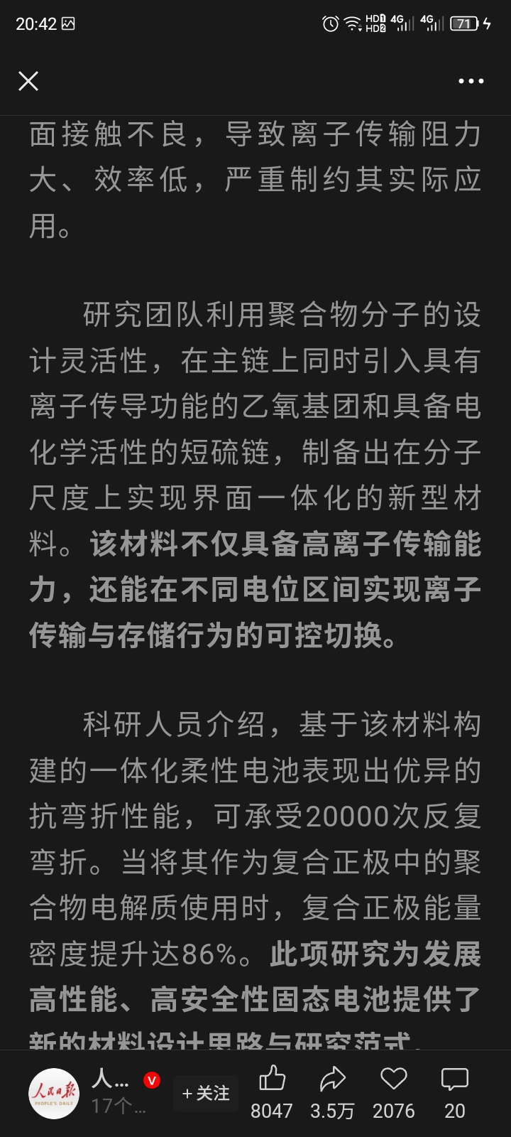 人民日报:固态锂电材料取得新突破,作为复合正极中的聚合物电解质使用,复合正极能量