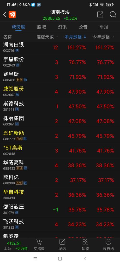 截止今日收盘,湖南板块今年1月涨幅前八名个股一览,五矿新能今日上午一度列第四名,