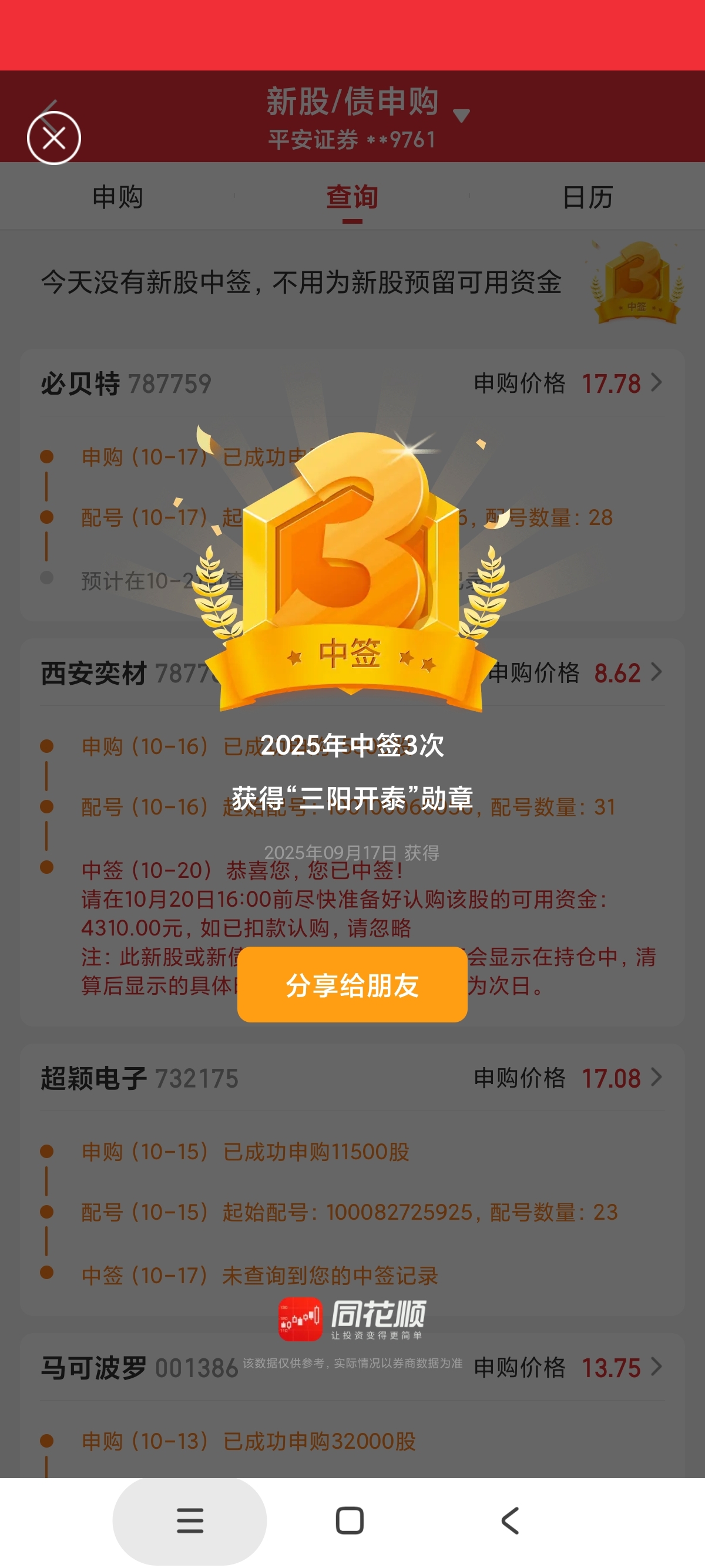 $西安奕材(SH688783)$ 今年中了三个,第一个江南新材赚了3万多,第二个忘记是啥了,赚了1万,今晚又中了这个,能赚5000就好